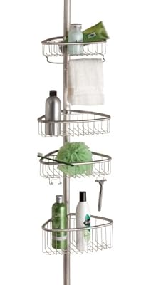 Add convenient storage shelves for shampoo and conditioner bottles, soap and body wash, razors, wash cloths, and more with this Stainless Steel Shower Caddy. Constructed from attractive, corrosion resistant brushed stainless steel, this tension pole shower caddy features four large shower shelves which can be placed at any height along the tension pole. Complete with a towel bar, hooks to hang brushes, loofahs, and razors from, and a deep shelf for large bottles, this corner shower caddy adds an attractive accent to your bathroom décor and extends up to 9' tall to accommodate most showers.